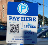 Modern parking fee programs provide many options. The parking lot behind 1st Security Bank uses a modern parking fee approach with a QR code or text to pay option. Depending on the vendor a phone call option may also be offered. These automated tools collect fees, provide for effective enforcement, and collect data such as time of day demand, duration of parking stays, and violation data.