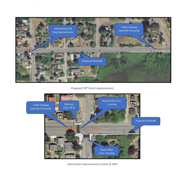 This project addresses a non-motorized transportation route gap by constructing approximately 1,300 feet of sidewalk on the southern side of 19th Street between Landes Street and San Juan Avenue. Project components to be considered during design include sidewalk, curb extensions, rectangular rapid flash beacons (RRFBs), buffered bike lanes, raised crosswalks, median islands, and Americans with Disabilities Act (ADA)-compliant curb ramps. The City has been selected to receive $763,000 in state funding from the Multimodal Transportation Account–State Appropriation (see attached award letter and project summary below). The City Transportation Benefit District is funding $75,000 of the total project budget of $838,000.