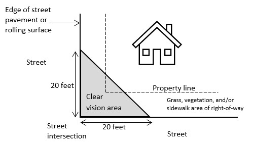 Plantings must not interfere with ‘sight lines’ at intersections; within the “sight triangle,” landscaping must be kept under 30 inches.